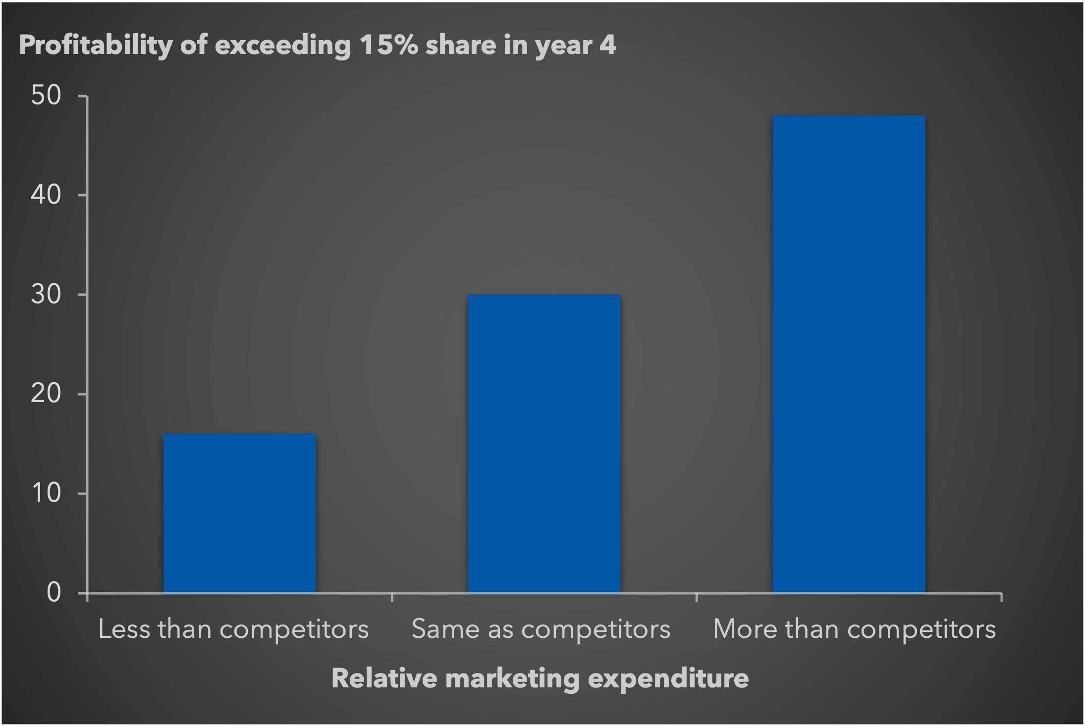 If we look at the single most important success metric – market share in year 4 – we see (Figure 3 below) that marketing aggressiveness is the most crucial driver. This is true whether we look at marketing spend (advertising, promotion, salesforce, market research, technical support, PR etc.) as a ratio to total served market sales (to capture the absolute aggressiveness) or versus competitors (to capture relative aggressiveness). While there is some circularity in the argument (companies expecting to gain high market share will spend more on marketing), the strength of the relationship is overwhelming. To get customers to buy, you have to create awareness with a big PR and advertising splash, stimulate trial with promotions, create orders by sales force activity, and keep things moving by combining all three.